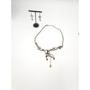 Vintage silver-tone and faux amber rhinestone necklace and earrings set. Necklace measures approximately 16-19". Earrings measure approximately 1.75". Good pre-owned condition with minor wear. Earrings show more wear/ discoloration of silver tone. Please see pictures.