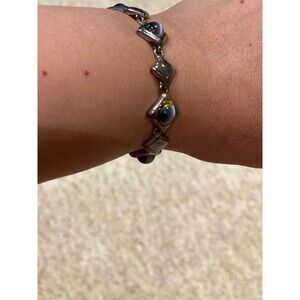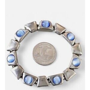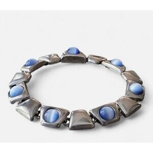 Very pretty bracelet with a high end costume jewelry appearance that features sparkling blue faux cats eye stones set in silver tone geometric trapezoid links. Easy to put on and easy to take off with a magnetic clasp. It measures approximately 7 1/2" long and 3/8" wide. It's in very nice condition without any issues.