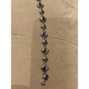 Very pretty bracelet with a high end costume jewelry appearance that features sparkling blue faux cats eye stones set in silver tone geometric trapezoid links. Easy to put on and easy to take off with a magnetic clasp. It measures approximately 7 1/2" long and 3/8" wide. It's in very nice condition without any issues.