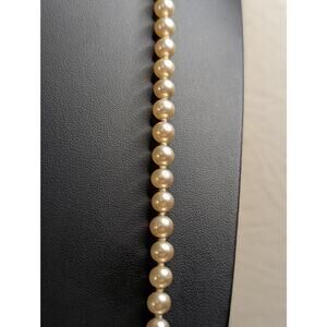 Vintage Faux Champagne Hand-Knotted 6mm Glass Pearl 32" Long Strand Necklace. Pre-owned, this long strand of faux pearls is in excellent vintage condition with the exception of one missing rhinestone on the fancy slide in clasp necklace that works great.