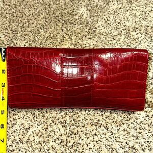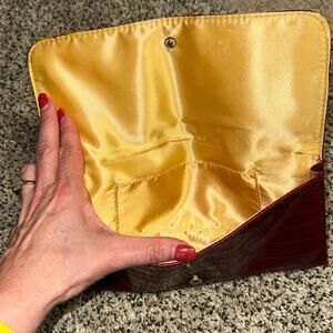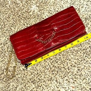 This beautiful vegan leather Croc embossed clutch has a convenient chain if you want to carry it around your wrist Beautifully lined with gold satin on the inside!