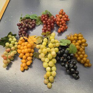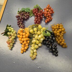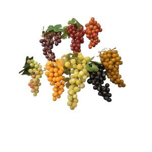 This lot of 8 vintage faux decorative grape bunch clusters is a colorful addition to any home decor, with a retro style that adds a touch of charm. Made of durable plastic, these fruit pieces are easy to care for with a simple clean with a damp cloth. Perfect for adults looking to enhance their space with a unique and eye-catching display, these assorted-sized clusters are sure to make a statement in any room.