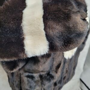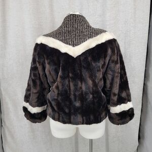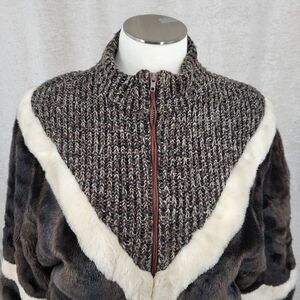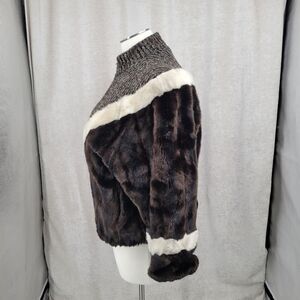 Vintage Faux Fur and Knit Jacket, full zip closure, lush and soft pile dark brown and black main with white/ off white contrast and knit yoke.