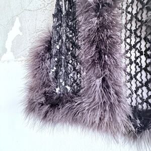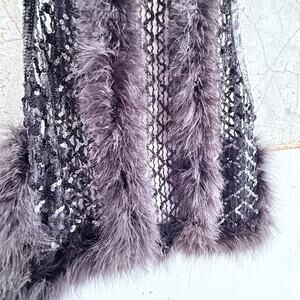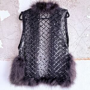 Vintage boho glam vest with a black mesh body covered in sequins and trimmed in soft faux fur. Lightweight but dramatic. It gives boho luxury energy think Stevie Nicks meets night-out sparkle. She transforms a simple tank and denim into a moment. Perfect for concerts, holiday parties, or festival fits.