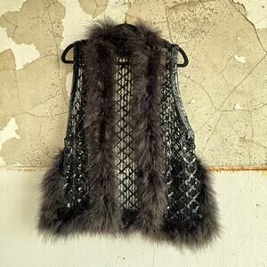 Vintage Faux Fur Sequin Vest Black Boho Glam Rock Festival 70s Retro Women’s M