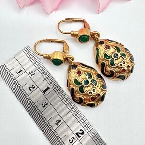 Vintage Faux Gripoix Turkish Style Enamel Dangle Earrings Ornate Leverback Chic