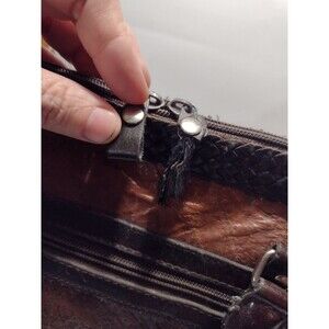 This vintage satchel handbag is made of distressed faux leather in brown with patchwork and braided accents. It features a zip closure, double handles in dark brown faux leather, silver hardware, and black fabric lining. The medium-sized bag has inner and outer pockets, inner dividers, and is water-resistant and stain-resistant. Ideal for travel, casual, workwear, or business occasions, this unisex satchel exudes a stylish and eco-friendly charm. This bag is an excellent condition one of the straps on one of the zippers is coming off but it doesn't affect the functionality of the zipper. Please see photos for condition details. Measures 14 inches wide by 10 inches high.