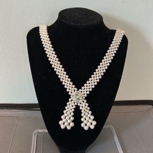 This stunning faux pearl necklace features a beautiful crystal accent and a rhinestone embellished clasp.