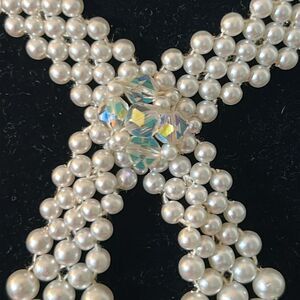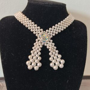 Vintage Faux Pearl Bow Necklace with AB Beaded Accent - Unsigned