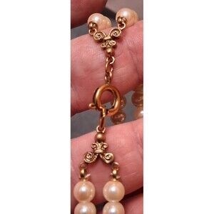 This exquisite vintage bracelet features a double strand of lustrous faux pearls, elegantly arranged to complement the central porcelain cabochon. The oval centerpiece showcases delicate roses in soft pink and deep burgundy hues, surrounded by an intricate gold-tone filigree frame that adds a touch of classic charm and sophistication. Looks painted, but probably a decal. Unmarked, probably from the 1970's or 1980's.