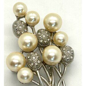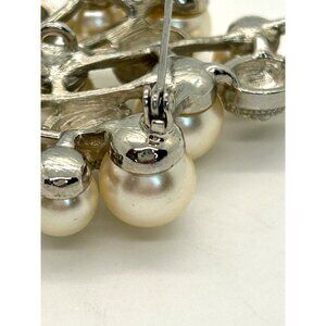 This elegant silvertone brooch features a charming balloon bouquet design adorned with faux pearls and glass crystals. It includes a delicate bow detail that adds a touch of timeless appeal.