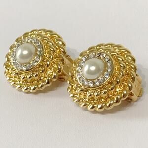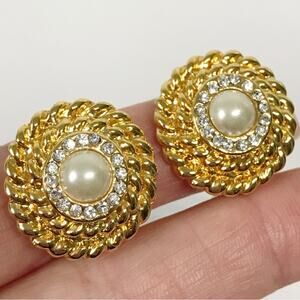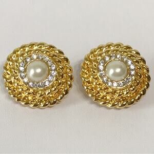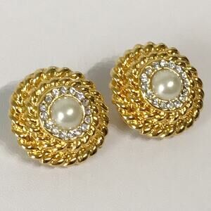 Vintage Gold Tone Faux Pearl Cabochon Bezel Set and Rhinestones Raised Dome Rope Cushion Clip On Earrings