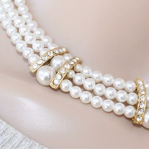 Vintage Faux Pearl Collar Necklace Wide Triple Strand Rhinestone Gold Plated