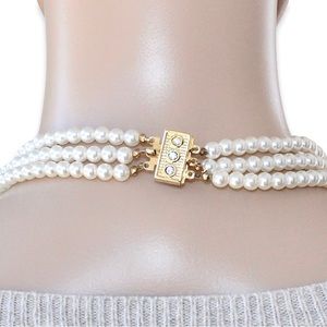 Vintage faux pearl collar necklace. Acquired from a private estate collection, this triple strand choker features three rows of white costume pearls and gold plated stations decorated with rhinestones. Box clasp closure. 16” length. Great pre-owned condition with light surface wear commensurate with age.