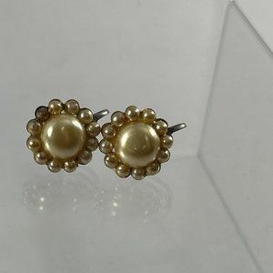 Vintage Faux Pearl Flower Shaped Screw Back Earrings Silver Tone
