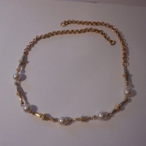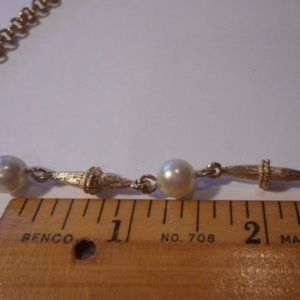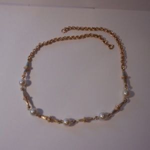 "Vintage faux pearl and gold tone choker necklace is about 16.5"" long, unknown maker, nice used condition, pretty