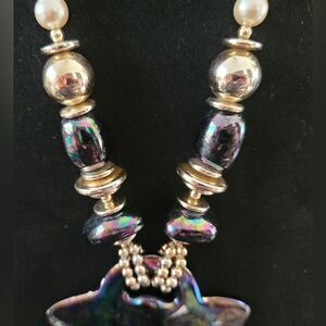 This stunning vintage necklace features a unique iridescent pendant that shimmers and changes color in the light. The pendant is paired with a classic faux pearl and gold tone bead strand, creating a beautiful and eye-catching piece.