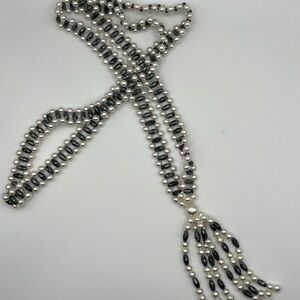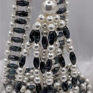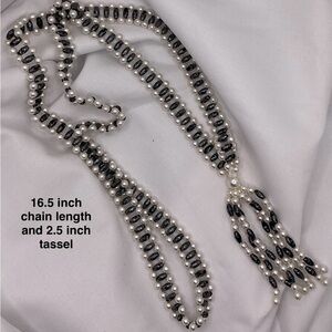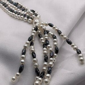 Stunning vintage lariat-style necklace featuring two rows of luminous faux pearls paired with iridescent black faceted beads. The elegant tassel drop adds beautiful movement and drama to any outfit. This timeless piece can be worn long or doubled for a layered look—perfect for formal occasions or adding vintage charm to modern styles.