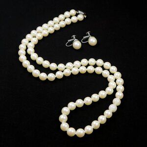 Elegant mid-century faux pearl jewelry set featuring a 24" necklace with a box clasp closure and matching adjustable clip-on earrings. All pieces are unsigned and in good vintage condition with gentle wear consistent with age. A timeless set for collectors, bridal styling, or classic everyday wear.