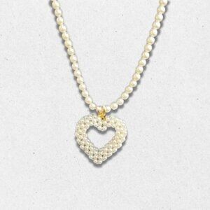 This Vintage Faux Pearl Heart Necklace featuring a strand of lustrous faux pearls, this charming piece is highlighted by a heart-shaped pendant crafted from pearls for a romantic touch. It is perfectly suited for any occasion, from casual to formal.