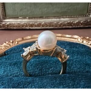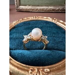 The ring has a classic, elegant style with a soft luster to the pearl and a sparkle from the rhinestones—perfect for vintage collectors or statement ring lovers. Estimated size: US 7.
