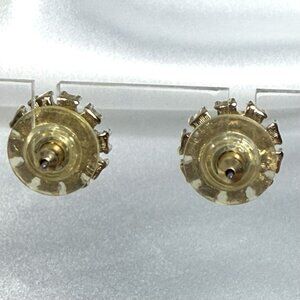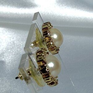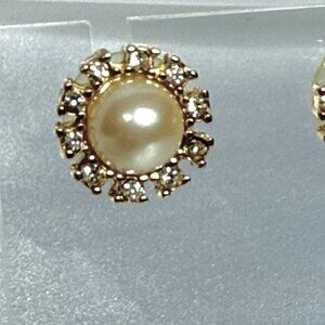 DESCRIPTION: Chic vintage-style post earrings featuring faux pearls surrounded by clear rhinestones in textured gold-tone settings. Though unmarked, they echo mid-century elegance / see photos for more details