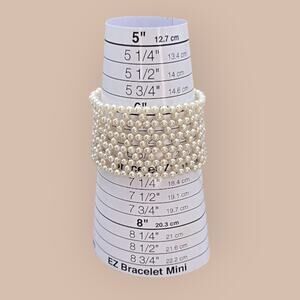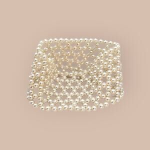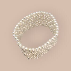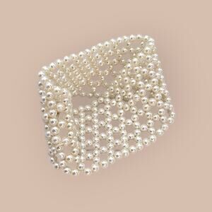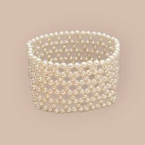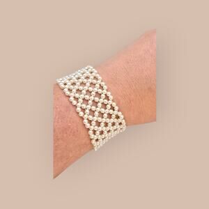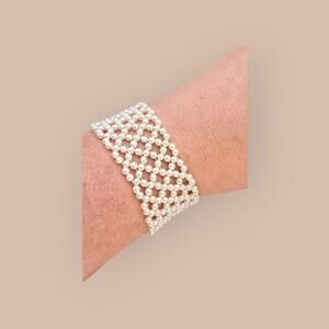 Featuring a striking lattice weave design crafted from glossy ivory faux pearls, this bracelet stretches comfortably to fit most wrists. Its wide band design offers a bold yet graceful statement, perfect for pairing with both casual and formal outfits.