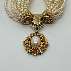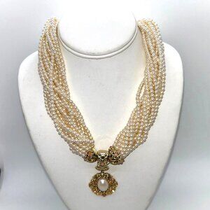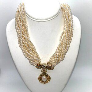 This elegant torsade necklace features strands of creamy faux pearls, an ornate gold-tone centerpiece, and a pendant with rhinestone accents, exuding timeless vintage charm.