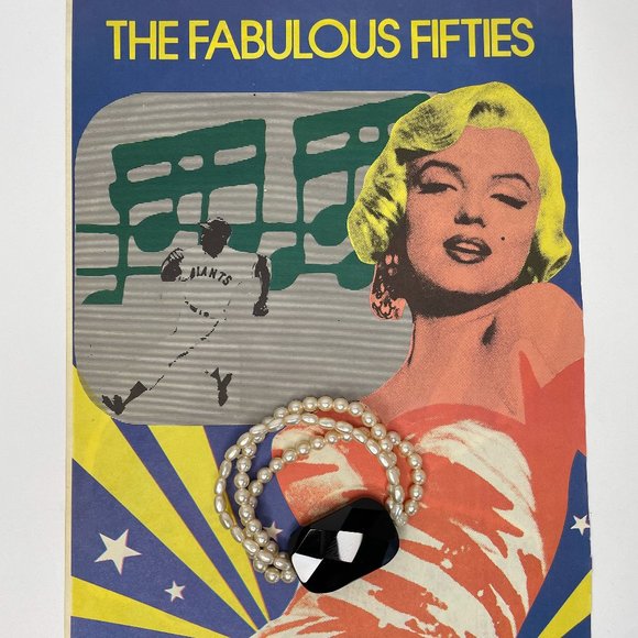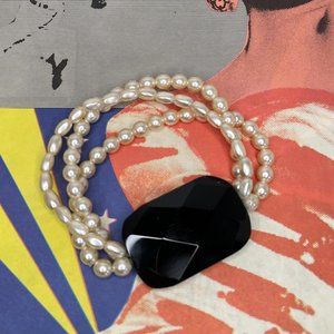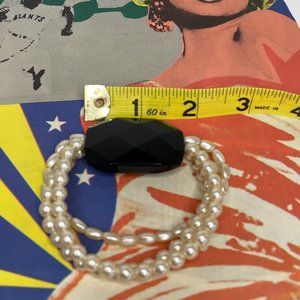 Gorgeous vintage faux three strand pearl and fake onyx bracelet. Very well made (onyx has some weight to it). The bracelet is made to stretch over the hand so there is no clasp. Dress up any vintage outfit and make it classy! Stone measures almost 2" long.