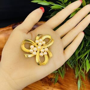 Vintage Faux Pearls Brooch Bow Ribbon Jewelry Textured Gold Tone Classy 4161