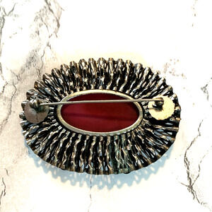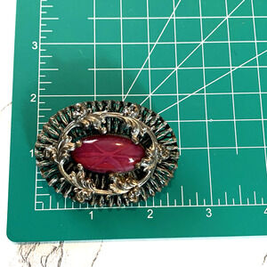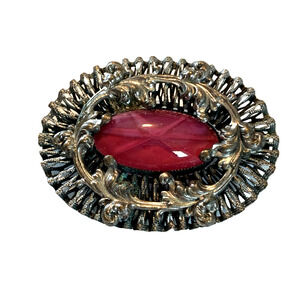 This vintage brooch features an ornate silver-tone setting with a deep raspberry red oval glass star sapphire style cabochon. This piece is in nice condition.