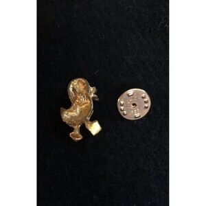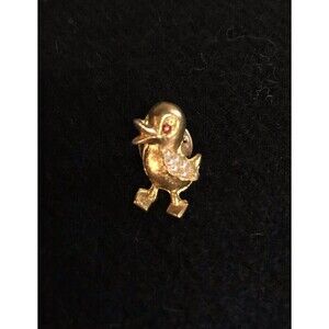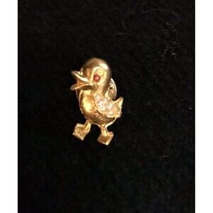 Here is a charming vintage lapel or hat pin featuring a cute baby duckling with a faux ruby eye and faux pearl wing. The gold tone metal adds a touch of sophistication to this playful collectible. It is perfect for pinback enthusiasts and will make a great addition to any collection.