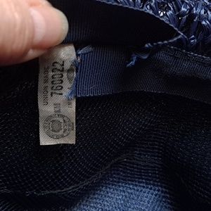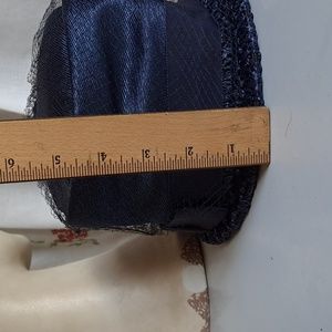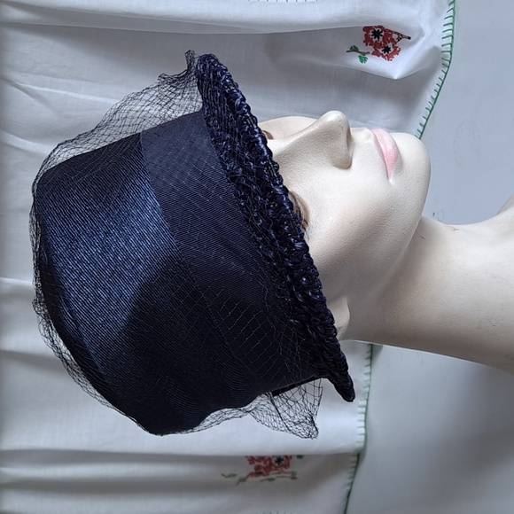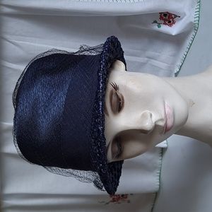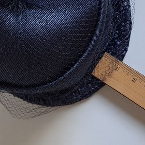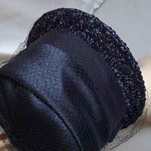 Navy blue hat with netting. Faux straw brim with grosgrain ribbon and bow at the back.