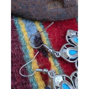 Vintage Southwestern Style Silver Tone & Faux Turquoise Earrings - Flower Dangle Earring Boho Festival Jewelry