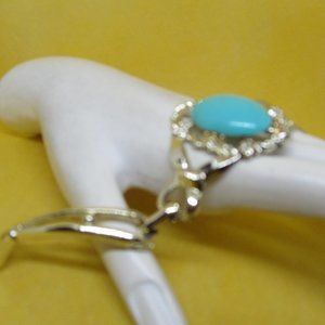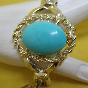 Vintage Faux Turquoise Gold Metal Bracelet Ornate Large Oval Lucite Cabochon