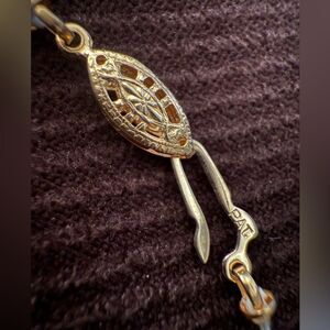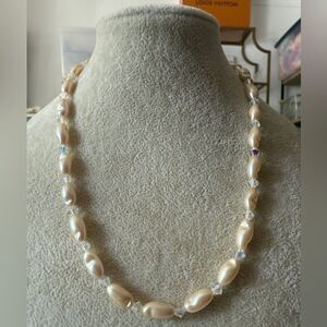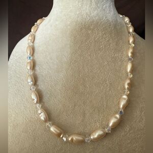 This elegant vintage necklace features luminous off-white faux baroque pearls beautifully complemented by clear faceted crystal beads that shimmer with every movement. The timeless strand is finished with an ornate gold-tone filigree fishhook clasp, marked “PAT” for its vintage design origin. The necklace measures approximately 16” in length, sitting gracefully at the collarbone—perfect for adding a touch of classic sophistication to any outfit.