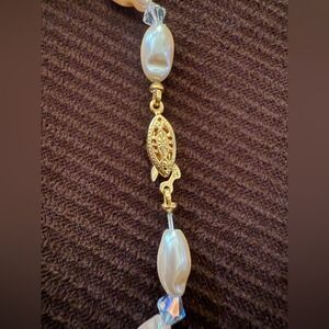 Vintage Faux Pearl & Crystal Bead Necklace with Gold Filigree Clasp