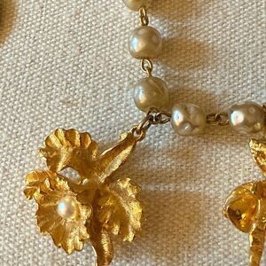Vintage Faux Pearl Gold Tone Link Bracelet with 6 Gold Tone Charms.