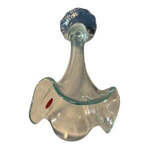 Add a touch of handcrafted elegance to your space with this vintage Faviluso trumpet vase, made in Venezuela. Crafted from clear glass with green-tinted edges along the ruffled rim, this vase features a flared opening and rippled pedestal base—an excellent example of mid-century artisan glasswork.