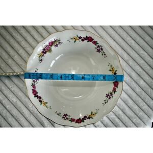 This beautiful Favolina Salad Serving Bowl is decorated with pink roses and finished with gold edging. It measures 9 1/2 in diameter and about 4" in height.