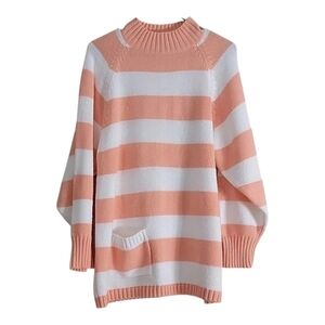 Cozy and retro Favorites striped knit sweater featuring wide peach and white stripes with a relaxed, slouchy fit. Designed with a ribbed mock neckline, long sleeves, and a cute single front pocket. Made in Hong Kong, which often indicates an authentic vintage piece from the 80s/90s.