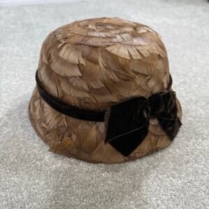 Vintage Feather Cloche Hat Brown Felt Velvet Ribbon Bow Retroglam Flapper 1920s