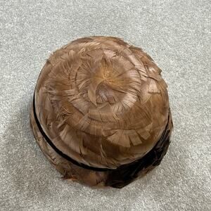 Description: vintage cloche hat with layered brown feathers throughout; dark velvet ribbon and bow trim; classic 1920s-inspired silhouette with a structured crown and narrow brim. Inner tag reads “Boutique – New York Montreal.”