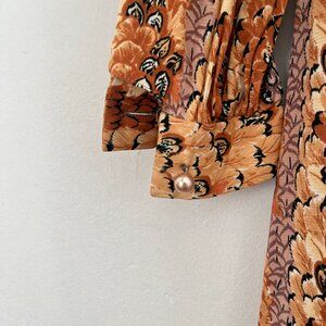 Incredible and unique vintage Feather Pattern Pearl Button Maxi. This dress can be worn all year round - wear it as a dress or long jacket for an event or brunch with friends. From the late 60s or early 70s,, pink pearl buttons. Made of polyester, no wrinkles :) No care instructinns or size on label, but fits like a medium. I'm a size small and I wear it slightly oversized. In very good shape, has loops for a belt but there is no strap. Discovered in NYC.