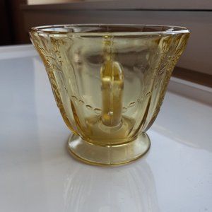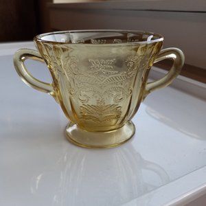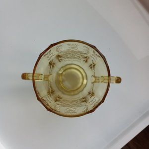 Bundle of two pieces of Vintage Federal Glass, Madrid pattern, reproduction dinner plate and sugar bowl. Federal Glass reissued this pattern for the Bicentennial under the name "Recollection" Depression Glass. Both are amber in color. The plate is marked " '76 ", indicating a Bicentennial reproduction. (Indiana Glass later bought the molds, and removed the number.) The plate measures approximately 10.25" across, .75" high, with a recessed circular interior of approximately 8.25" in diameter. Has two - three barely-discernable tiny scratches (photo 8), with no other discernable scratches. The plate is in excellent vintage condition, with no cracks/chips/flea bites. The sugar bowl measures approximately 3.25" tall with a 3.50" diameter opening. I have not found the "'76" mark on the bowl, so it may be an Indiana Glass reproduction. There is a barely-discernable chip along the rim (last photo), and some very light roughness -- not flea bites -- around the base, mostly at the seams. No cracks/discernable scratches. In good vintage condition. Overall, the pieces are in good - very good vintage condition.