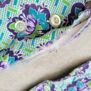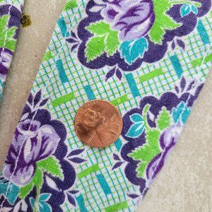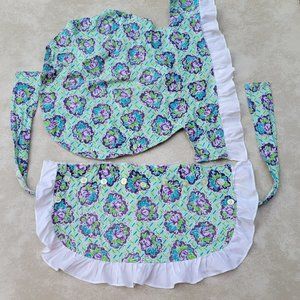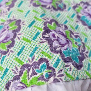 It is made of a floral Green, Blue, Purple and White Cotton Feed Sack material trimmed in a ruffled hem of plain white cotton or cotton blend. The neck ties are made of the same feed sack material.