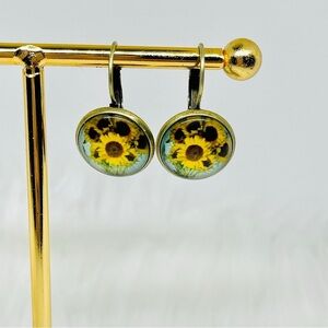 These Vintage like Floral Print Design Earrings are the perfect addition to your jewelry collection. Crafted from copper and glass, they feature a beautiful sunflower image with a vintage feel. Measuring 1.18" long, these earrings are sure to make a statement.