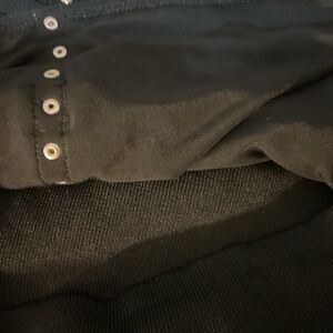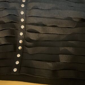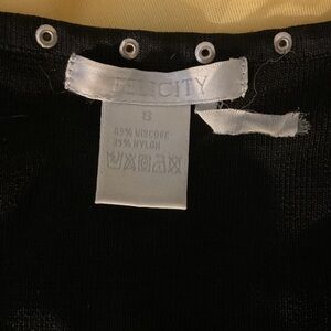 Vintage Felicity brand tank with studs and split ribbon type front. The back is smooth. The studs are placed through the front th and the lining. This is very high quality. The studs line both sides of the font of the shirt. Size 8 in a form fitting black sleeveless top. It would be great with a blazer.
