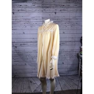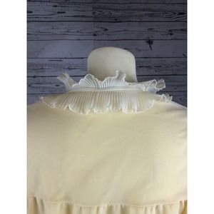 What’s vintage robe that double layered, yellow on inside with an over layer in tulle. yellow with cream frilled neck, cuffs & hem. Open front with 2 ties at the top for closing. Cream & yellow flowers in the top front
