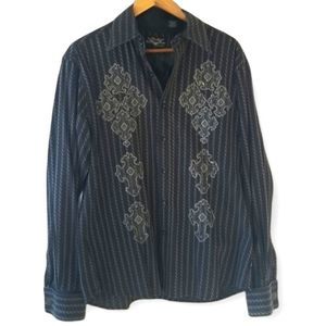 This Fender shirt by Da Vinci is a great shirt! It has a rocker vibe, but would also look great with a pair of jeans and cowboy boots.